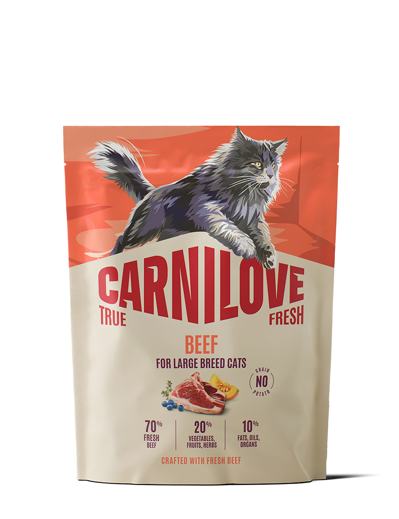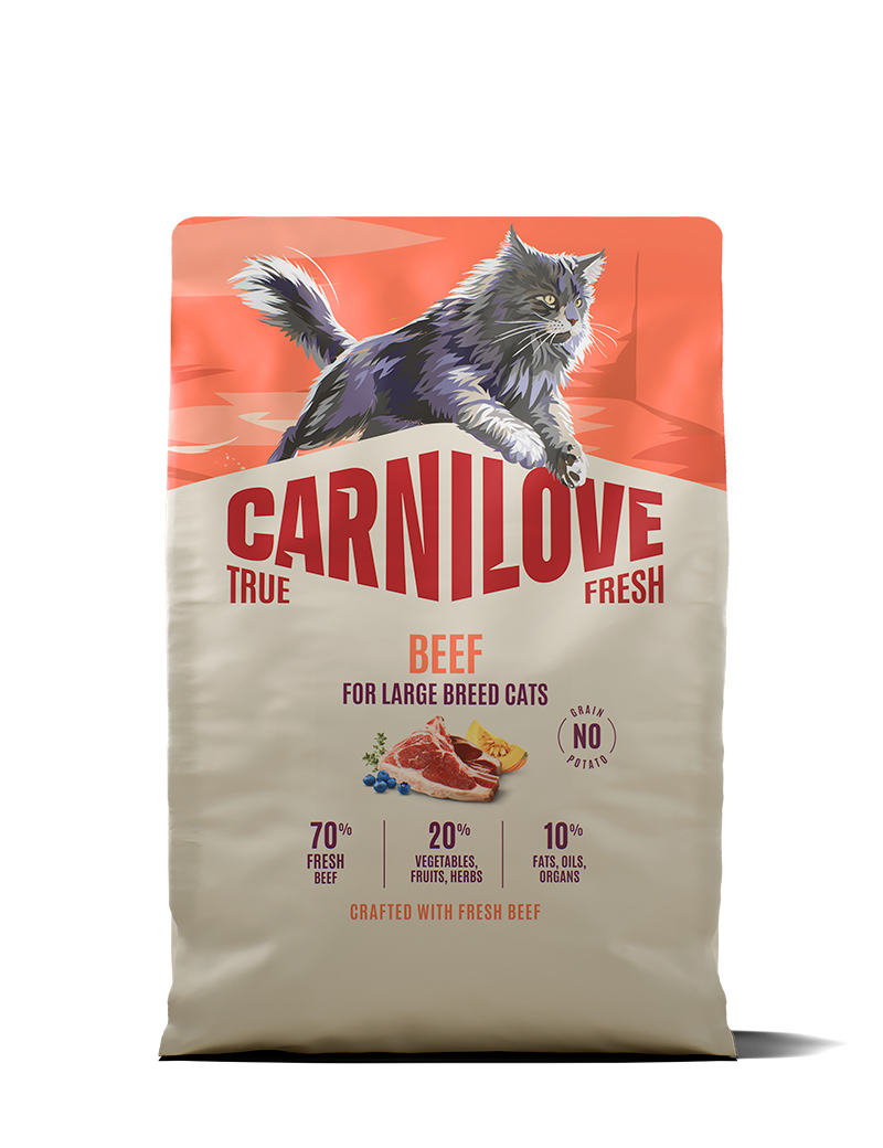 Detta recept med färskt nötkött är idealiskt för vuxna stora raskatter som väl respekterar deras naturliga näringsbehov. Lättsmält protein stödjer starka muskler och allmän kondition, medan pumpa och baljväxter hjälper matsmältningen. Havtorn, tranbär och blåbär stärker det naturliga försvaret, laxolja och linfrön håller huden smidig och pälsen tjock och len, och naturliga källor till glukosamin och kondroitin stödjer friska leder. Helfoder för vuxna stora raskatter.