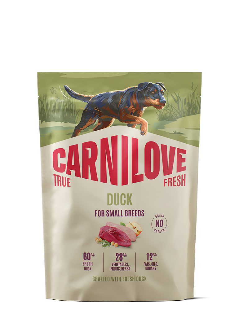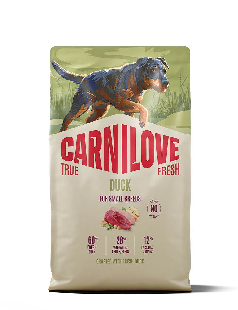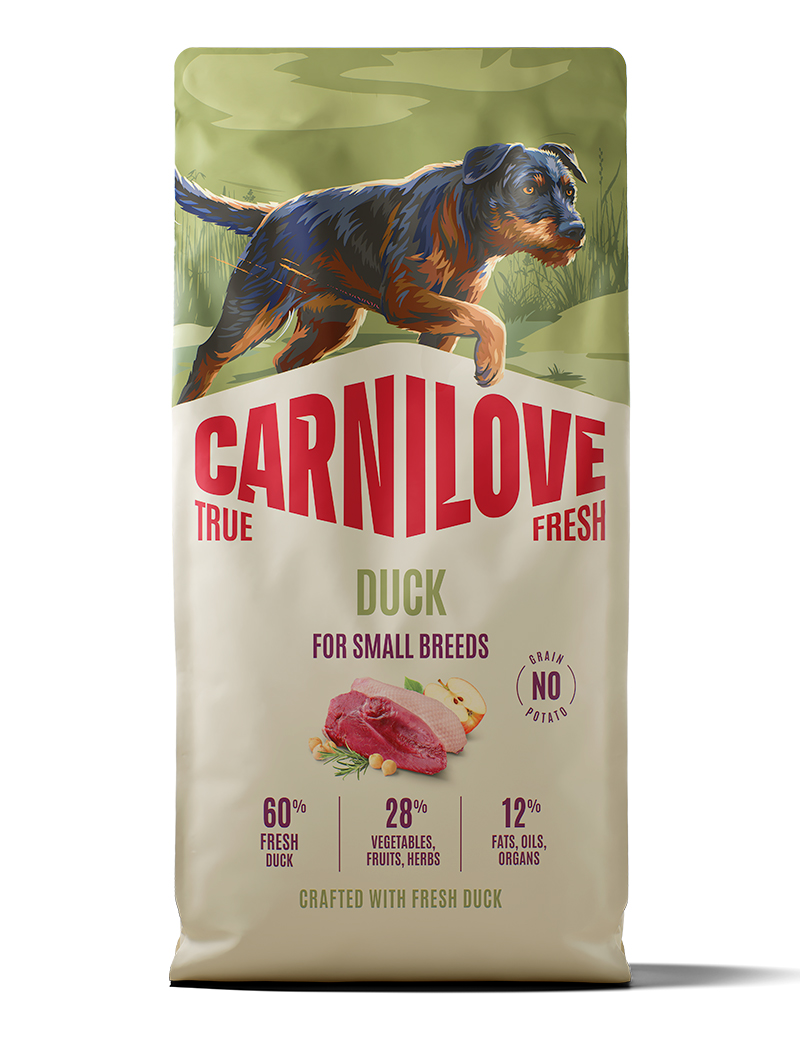 Färsk anka (60 %), gula ärtor, nötköttsfett (7 %), hydrolyserad lever (3 %), kikärtor (3 %), pumpa (3 %), röda linser, torkad äppelmassa (2,3 %), laxolja (2 %), linfrö, morot, äggskal, kaliumklorid, ärtmjöl, torkad havtornsbär (0,2 %), torkad ingefära (0,1 %), torkade blåbär (0,1 %), torkad rosmarin (0,1 %), torkade tranbär (0,1 %), torkad timjan (0,1 %), hydrolyserade skal från kräftdjur (glukosaminkälla, 0,022 %), cikoriarot (en källa till frukto-oligosackarider, 0,0163 %), broskextrakt (en källa för kondroitin, 0,014 %), bryggerijäst (en källa till mannan-oligosackarider, 0,013 %), yucca schidigera (0,0085 %).